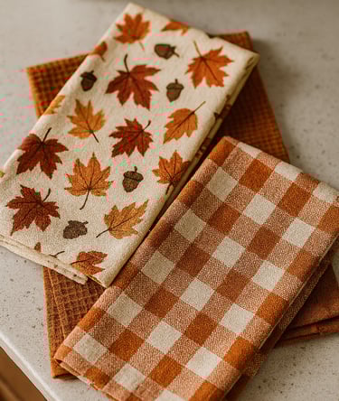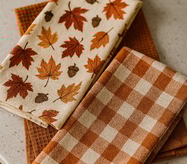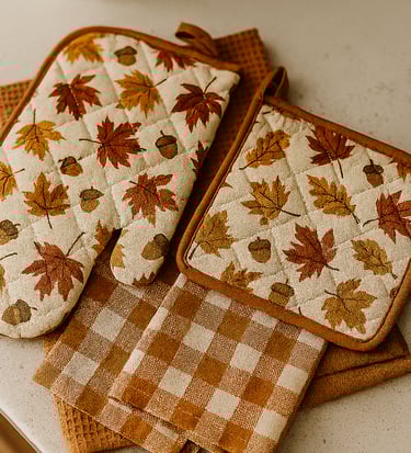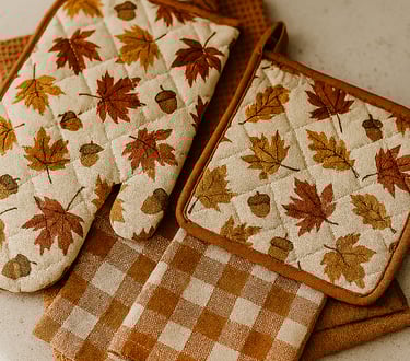 Trade your lightweight summer linens for thicker, cotton or flannel fabrics. Think plaid tea towels, chunky oven mitts, or a soft woven tablecloth — small swaps that make a big difference.
