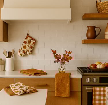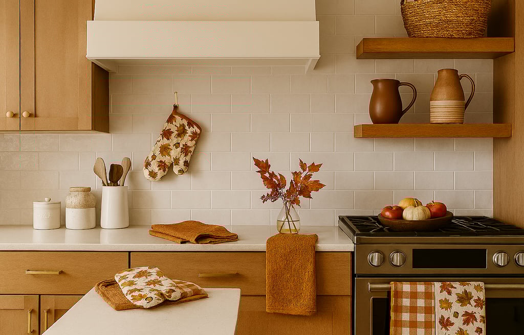 Try updating your kitchen textiles first: switch to fall-toned tea towels, oven mitts, and table runners. You can also add rust-colored candles or ceramic vases to your countertops for an instant autumn feel.